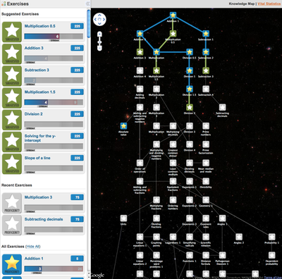 Certaines classes pilotes à Los Altos ont remisé leurs manuels pour travailler avec la Khan Academy. Chaque élève travaille à son rythme et l’enseignant accède à un tableau de bord qui lui montre les progrès de chacun. Il peut ainsi visualiser les notions acquises, celles sur lesquelles travaillent les élèves et bien sûr, celles avec lesquelles les élèves rencontrent des difficultés, ce qui lui permet d’intervenir. Pour chaque élève, l’enseignant accède à un tableau de bord détaillé du travail de l’élève : mesurant le temps passé, les exercices accomplis, les vidéos vues… Il a également accès à une synthèse des connaissances de sa classe, lui permettant de voir l’évolution de tous les élèves (on peut d’ailleurs gérer une classe facilement via la Khan Academy). En introduisant le suivi personnalisé, on constate bien les rythmes d’apprentissages différents des enfants, estime Salman Khan. On constate également qu’une fois un concept compris et su, bien souvent, la suite est plus facile. « Beaucoup d’efforts pour humaniser la classe se concentrent sur les rapports entre l’élève et l’enseignant. Pour nous, l’humanisation dépend d’un rapport entre l’élève et un temps d’apprentissage profitable avec le professeur. Dans un enseignement traditionnel, le prof passe son temps à donner des cours, des exercices et des contrôles. Peut-être que 5 % de son temps est vraiment passé à rester assis à côté des élèves pour leur expliquer quelque chose et travailler vraiment avec eux. Grâce à nous, 100 % de leur temps peut-être consacré à cela ! »