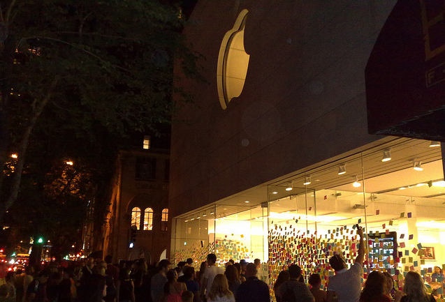 Image : Image de l’Apple Store de Chicago photographié par Marit & Toomas Hinnosaar, montrant, ici comme ailleurs, l’émotion qu’a suscité le décès du fondateur d’Apple.