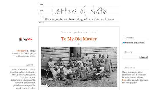 Image : La une du site Letters of note illustrée d’un groupe d’esclaves en Virginie en 1862 provenant de la Bibliothèque du Congrès.