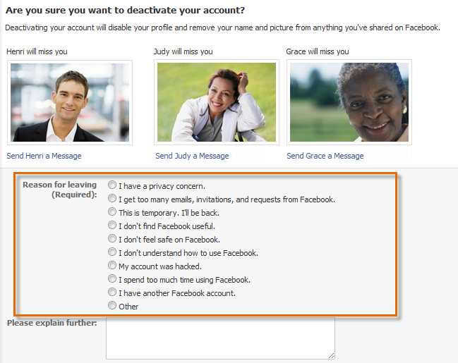 Que se passe-t-il pourtant quand on essaye de supprimer cette identité ? Gordan Savicic a tenté de supprimer son profil. Il en détaille les difficiles étapes. Quand vous cherchez à supprimer cette identité, Facebook vous propose une multitude d’options. Il fourbit une galerie aléatoire de vos relations qui vous disent que vous allez leur manquer, comme si vous deviez les perdre à jamais. Facebook vous demande de remplir un questionnaire pour expliquer pourquoi vous souhaitez quitter le système, « pourquoi prenez-vous ce risque ? ». Pour chaque raison, Facebook propose des réponses adaptées pour vous retenir, pour réfuter vos dénégations, comme bien sûr, de modifier vos préférences d’intimité. On vous demande plusieurs fois votre mot de passe ou de remplir des captchas comme autant d’étapes pour compliquer ce départ. Bien sûr, si vous franchissez l’ultime limite, votre compte n’est plus public, mais Facebook conserve encore de nombreuses données.