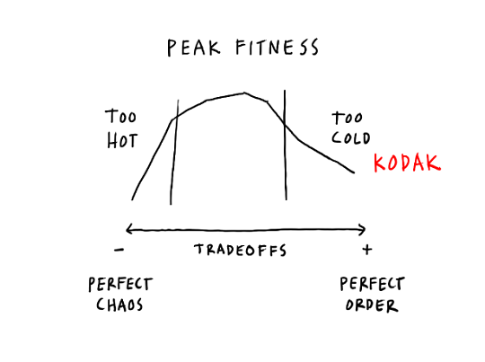 Où se situerait alors l’idéal entrepreneurial entre nos compromis, allant du chaos total à l’ordre parfait ? On voit que lors des premiers choix, des premiers pas d’un produit, on a une amélioration très forte de celui-ci, avant qu’il atteigne un plateau… Puis, à mesure qu’on l’optimise pour toucher un environnement plus large, la zone de confort qu’on habite se réduit alors même que d’autres entreprises conquièrent de nouvelles niches, s’adaptent, font bouger le marché. « Où se situe votre entreprise dans ce schéma ? », questionne le consultant. Kodak a inventé l’appareil photo numérique bien avant que celui-ci ne devienne populaire, mais ses dirigeants n’ont pas vu l’intérêt de pouvoir un jour regarder ses photos sur une télévision ! Kodak était sur un marché dont elle n’a pas su se défaire. « On peut voir les tendances bouger, mais se transformer est parfois plus difficile », rappelle avec modestie le designer.