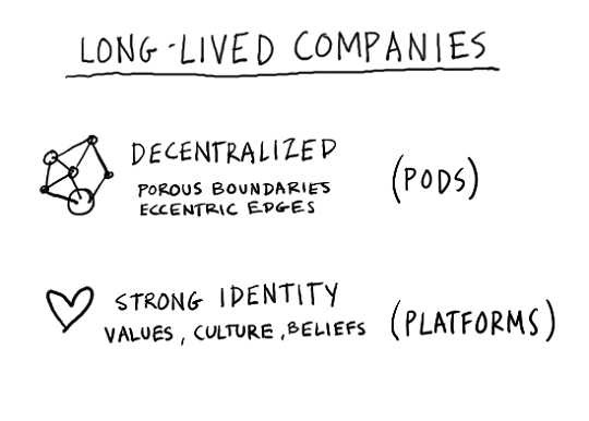 La durée de vie des grandes entreprises s’est considérablement réduite, elle est en moyenne aujourd’hui de 15 ans, comme l’expliquait Richard Foster dans La destruction créative dès 2001. Pire. Plus il y a de salariés dans une entreprise, moins elle est productive, rapporte une autre étude… On peut légitimement se demander pourquoi il en est ainsi, alors que les villes par exemple, autre organisation sociale, fonctionnent exactement à l’inverse de ce modèle. Dans The living company (qui fut traduit en français sous le titre La pérennité des entreprises), Arie de Geus (Wikipédia), l’inventeur du concept d’entreprise apprenante qui a officié toute sa vie dans le groupe Royal Dutch/Shell, où il fut l’un des pionniers de la technique de planification par la scénarisation, explique qu’il avait commandé une étude, à une époque où Shell s’inquiétait de l’épuisement des ressources pétrolières, pour comprendre comment certaines entreprises avaient survécu à de grands changements dans leur environnement. La conclusion de l’étude, jamais publiée, était que les entreprises qui avaient survécu étaient à la fois très décentralisées (c’est-à-dire qu’elles avaient des « frontières poreuses » et des « bords excentriques »), tout en ayant une très forte identité (c’est-à-dire des valeurs, une culture, des croyances). Pour Dave Gray, cette décentralisation correspond à ce qu’il appelle Pods et l’identité Plate-forme.