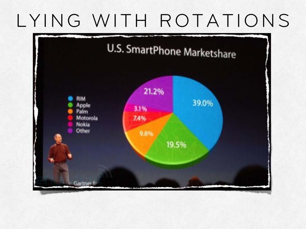 Lorsqu’on crée une image, la façon dont le spectateur recevra les informations peut être influencée par le mode de présentation. Dans une présentation effectuée par des étudiants des Gobelins (Vivien Cormier, Danielo Jean-Louis et Marine Crespel) on voit très bien cela avec un « camembert » créé par Apple représentant le marché des smartphones. Si l’on regardait attentivement les chiffres, Apple était en troisième position en terme de ventes, mais grâce au jeu des couleurs et des contrastes la part du diagramme correspondant à la société américaine donnait l’impression que celle-ci venait en second…