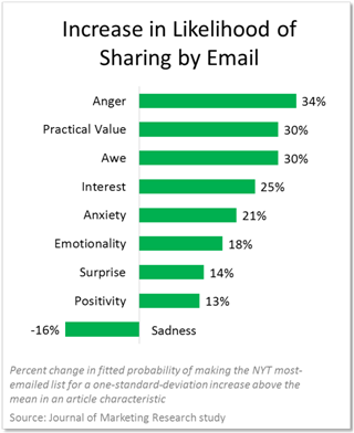 Une première trouvaille – que le journaliste du New York Times considère comme la découverte la plus importante des sciences sociales de ce début de siècle – est que les articles de la rubrique « Science » apparaissaient beaucoup plus souvent dans cette liste que les autres. Cela viendrait du fait que la science suscite un sentiment d’admiration respectueuse et incite les lecteurs à partager cette émotion positive avec d’autres. Les lecteurs ont aussi tendance à partager les articles qui les ont excités ou amusés, ou qui ont inspiré des émotions négatives comme la colère ou l’angoisse. En revanche, ils partagent peu des articles qui les ont laissés dans un état de tristesse. Ils ont besoin d’être sollicités, et préfèrent les bonnes nouvelles aux mauvaises. Plus l’article est positif, plus il sera partagé.