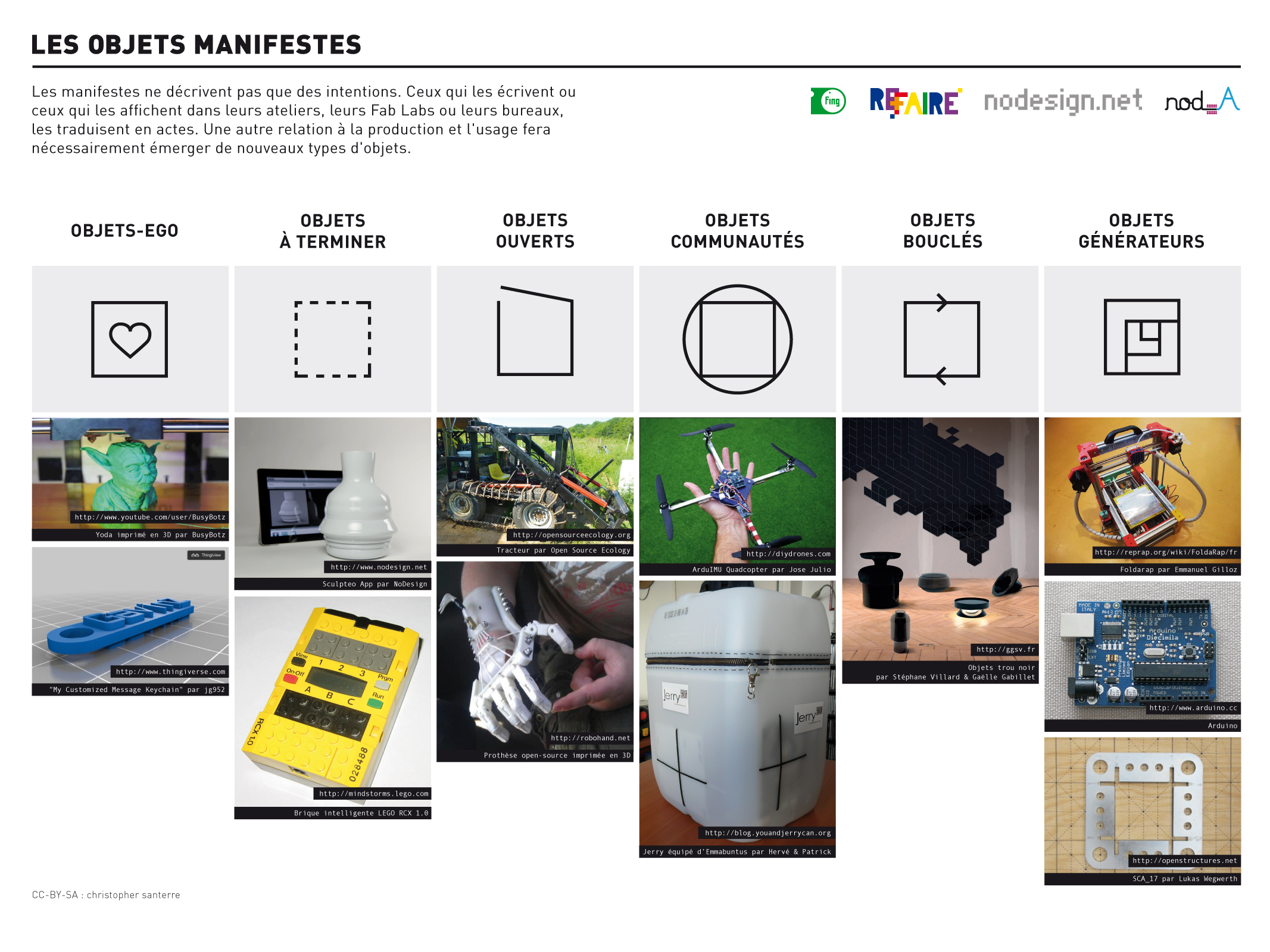 Les manifestes ne décrivent pas que des intentions. Ceux qui les écrivent ou ceux qui les affichent dans leurs ateliers, leurs Fab Labs ou leurs bureaux, les traduisent en actes. Une autre relation à la production et l’usage fera nécessairement émerger de nouveaux types d’objets.