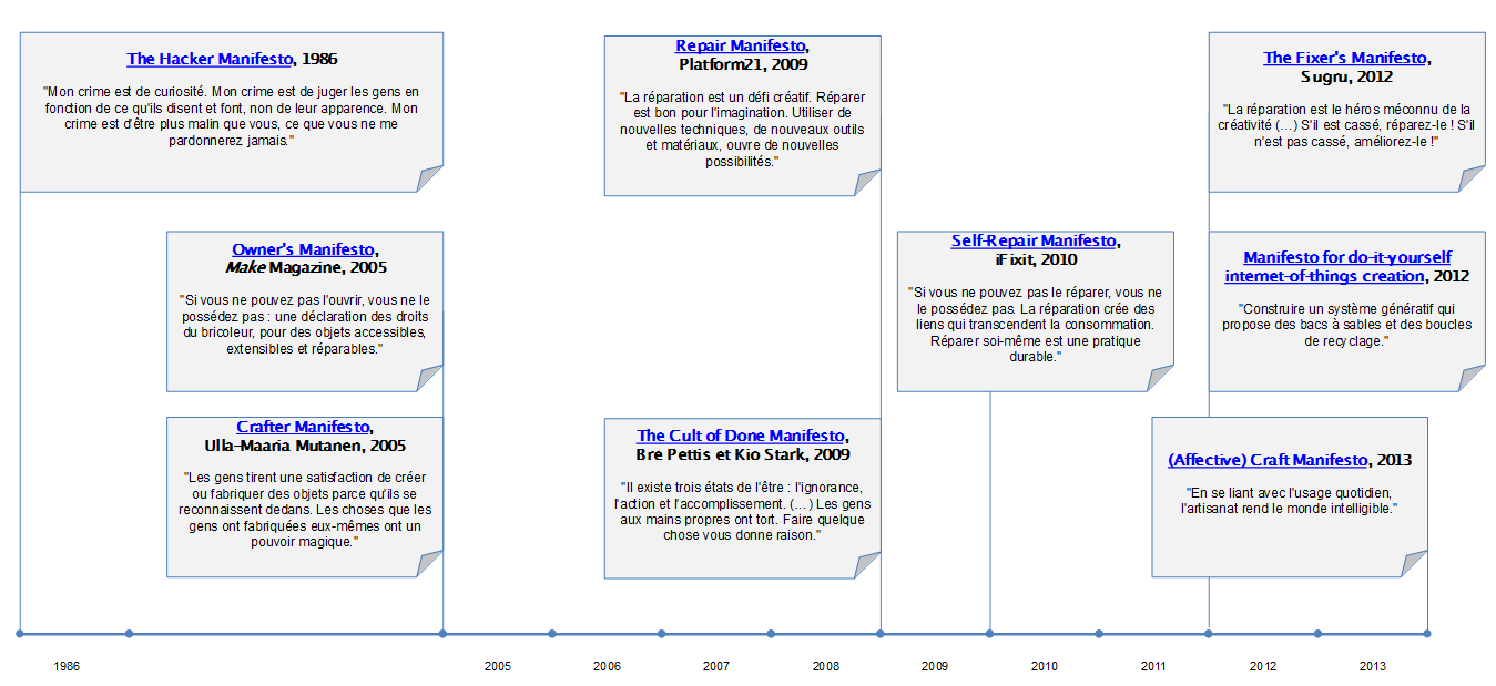 Les premiers manifestes de makers apparaissent en 2005. Le Crafter Manifesto (« manifeste du bricoleur/artisan ») de la designeuse et entrepreneuse finlandaise Ulla-Maaria Mutanen exprime à la fois le plaisir que l’on peut trouver à fabriquer ses objets soi-même et, déjà, l’idée que ces pratiques personnelles trouvent un nouveau sens (y compris économique) lorsqu’elles se mettent en réseau. Egalement publié en 2005 sur le site du tout jeune magazine Make [1], le Owner’s Manifesto (« manifeste du propriétaire ») s’adresse plutôt aux designers et fabricants auxquels il oppose une « déclaration des droits du maker » : seuls des produits documentés, faciles à ouvrir et à réparer, nous « appartiennent » vraiment ; toute autre option est suspecte.