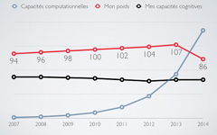 La bipédie est une caractéristique physique des homo sapiens et de quelques autres espèces. La nôtre est permanente, comme l’autruche, explique le développeur qui sait aussi se faire anthropologue. Nos corps et nos capacités cognitives fonctionnent de la même manière que nos ancêtres. « Notre corps biologique est celui du temps de l’évolution, plus que celui du temps de mutation des techniques ou du temps des transformations des modes de vie. » Alors que nos capacités de traitement informatique n’ont cessé de progresser, nos capacités cognitives, elles n’évoluent pas. Et nos capacités physiques ? Benoit Pereira da Silva présente un amusant graphique où il rapproche l’évolution dans le temps de ses capacités cognitives (stables), des capacités de traitement des ordinateurs qu’il utilise et de son poids. Sur le graphique, sa prise de poids jusqu’en 2013, date où il s’est mis à travailler en marchant, est on ne peut plus régulière.