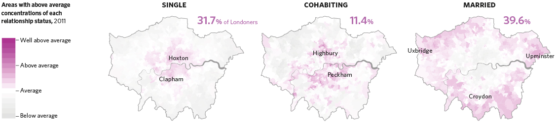 Image : Dans London : The Information Capital, le livre de cartographie sur Londres publié par James Cheshire et Olivier Uberti, on trouve une cartographie des statuts matrimoniaux des habitants de Londres, montrant que le centre de la capitale britannique compte surtout des célibataires, et que les couples mariés ont tendance à s’éloigner du centre ville, tout comme les couples avec enfants parisien s’exilent en banlieue.