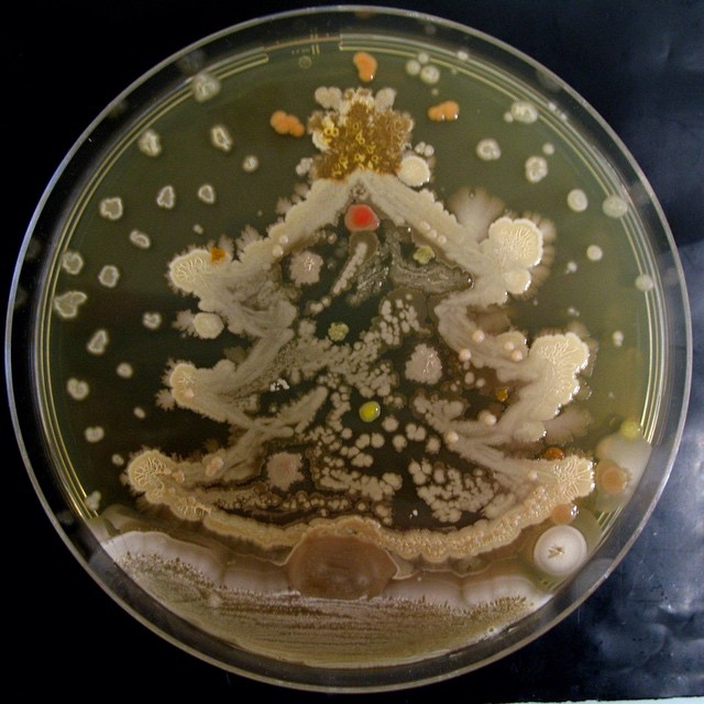 Image : Un arbre de noël réalisé grâce à une microculture biologique par Rositsa Tashkova de l’université de Nantes via MicrobeWorld.