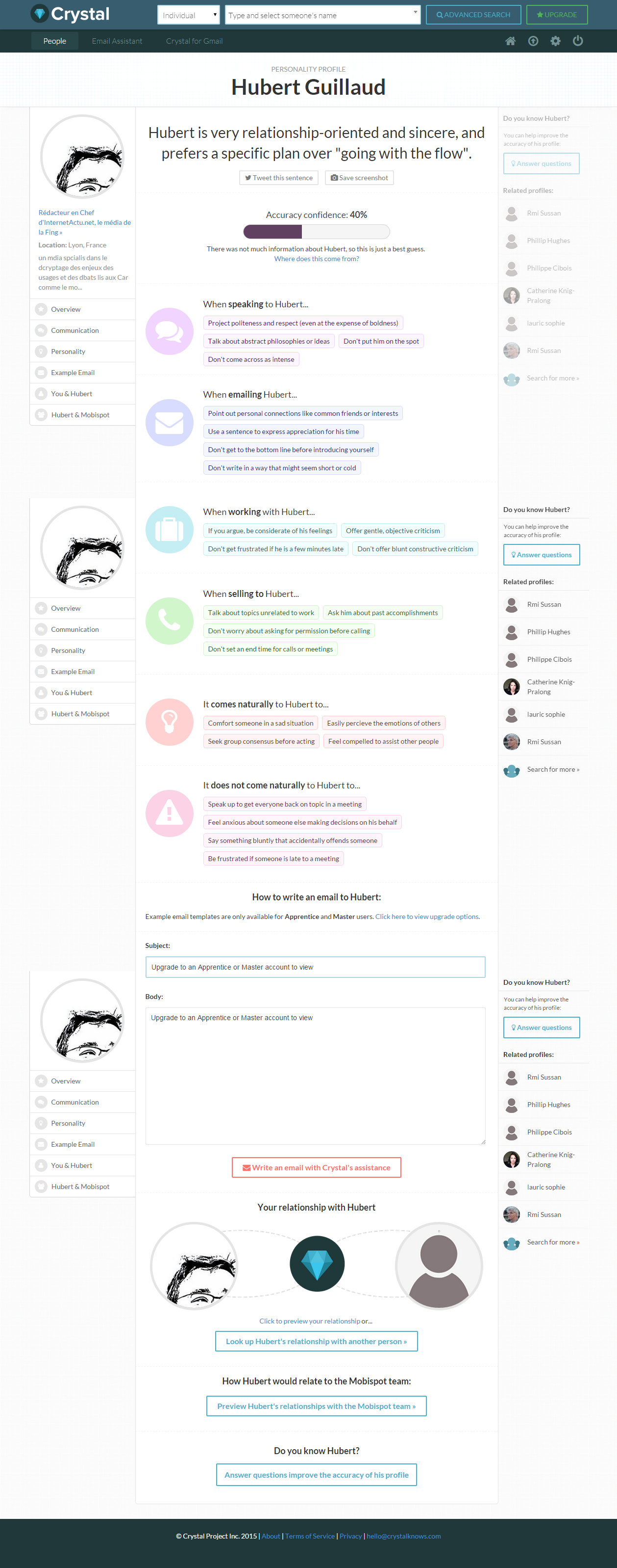 Disponible pour l’instant seulement pour Gmail pour Chrome, l’application s’ajoute à votre webmail. Lorsque vous rédigez un mail, elle vous propose de vous renseigner sur votre correspondant et établit son profil psychologique par l’analyse des contenus qu’il a posté sur le web social. Puis Crystal Knows vous dresse une liste de recommandations pour mieux rédiger votre message. Outre des conseils généraux, il vous fait des conseils sur le style à employer (écrivez des phrases courtes, utilisez un langage familier ou soutenu, utilisez des formules de politesse ou n’utilisez pas de salutations formelles), mais également des conseils sur comment mieux capter son attention ou comment avoir un échange avec cette personne pour lui vendre quelque chose. Ces recommandations sont pour l’instant assez basiques, mais, en s’adaptant au profil de chaque utilisateur, elles soulignent ce à quoi votre interlocuteur devrait être sensible ou allergique, pour mieux engager la conversation avec lui.