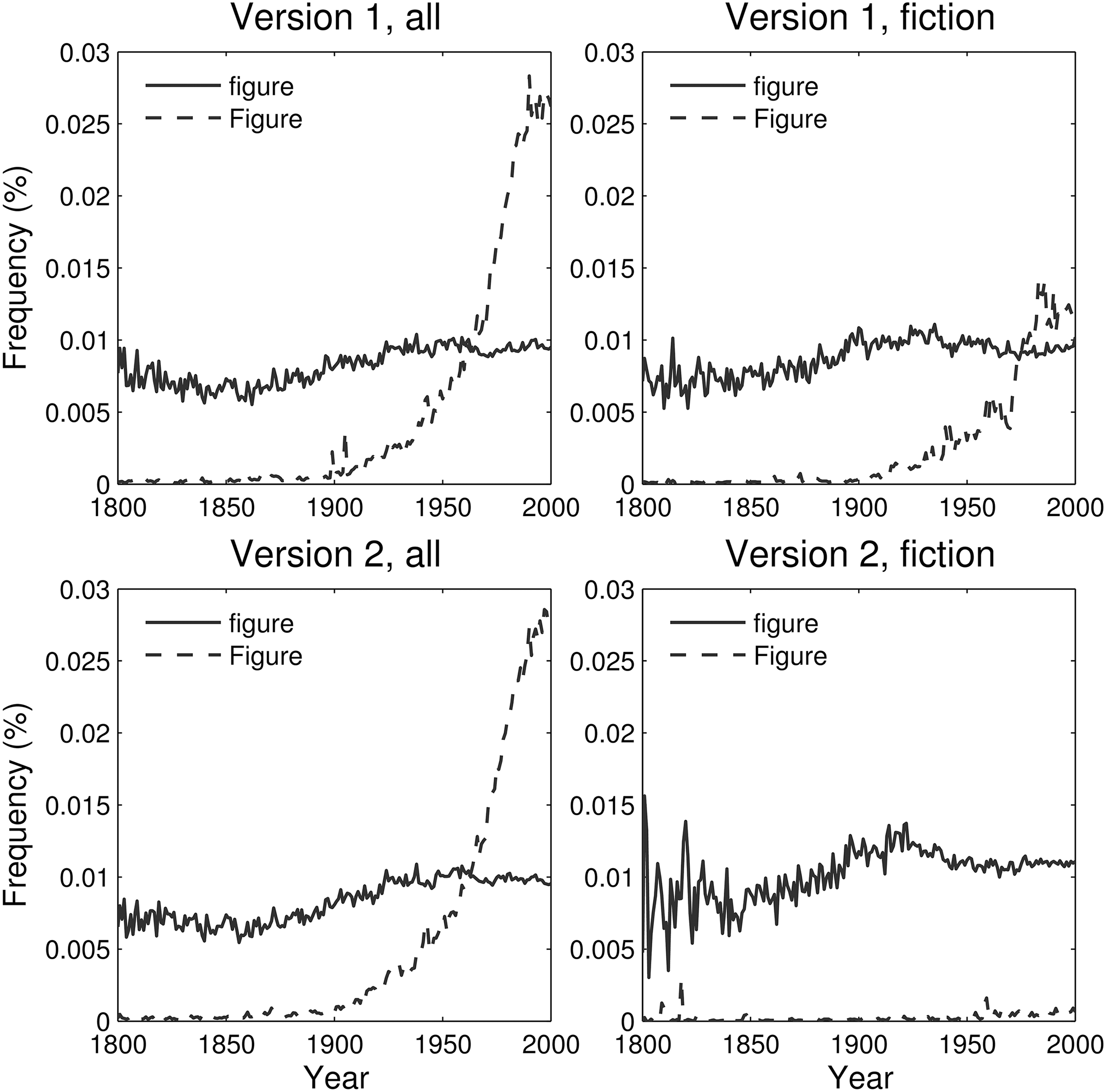Apparemment cela ne marche pas très bien. Comme nous l’apprennent les auteurs de la publication de PLosOne, le corpus de Google Books a été constitué en deux fois. Une première en 2009, la seconde en 2012. Si vous observez les différentes options du menu Ngram vous remarquerez qu’effectivement vous avez le choix entre « English Fiction » et « English Fiction (2009) ». Si vous faites une recherche sur la version 2009, vous observerez que le mot « Figure » est là aussi plus utilisé que « figure », ce qui laisse à penser que le premier groupe de données, en 2009, n’a pas été correctement filtré. En revanche, si vous choisissez l’option « English Fiction », vous avez là des courbes qui semblent à peu près correctes et logiques. Mais si vous prenez l’option « All », alors là, c’est bien « Figure » qui se trouve largement en tête.