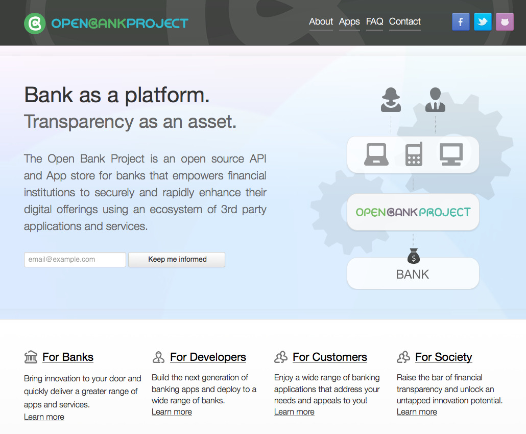 Pourtant, certains s’y essayent. Ismael Chaib de Tesobe est l’un des responsables du projet Open Bank, qui vise à faire de la banque ouverte une réalité. Si en 2010, beaucoup se demandaient encore l’utilité d’avoir une API, d’ici 5 ans, toutes les banques en proposeront, estime le développeur. Confrontées à l’explosion des attentes des utilisateurs en terme de nouveaux services (notamment en solutions de paiement pair-à-pair par mobile par exemple ce que propose FidorBank), à l’explosion des compétiteurs (de sociétés qui ne sont pas des banques, mais qui proposent des services bancaires, comme Teller.io), au vieillissement de leurs infrastructures techniques (qui peinent à s’adapter aux changements) et aux nouvelles formes de régulation qui risquent d’imposer demain ces nouvelles formes d’échanges, les API apparaissent comme une solution, permettant de créer de nouveaux canaux de distribution, d’expérimenter et de développer de nouveaux modèles d’affaires.