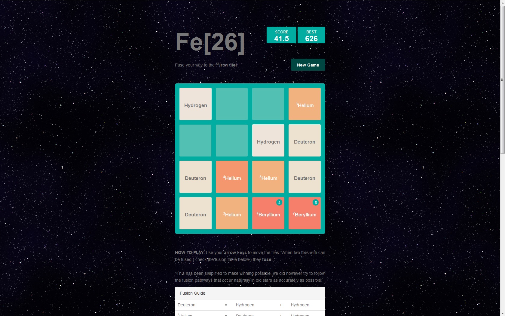 Si vous désirez comprendre tous les mécanismes de la fusion à l’œuvre au sein des étoiles, le mieux est de jouer à ce jeu, variation du célèbre 2048, grâce auquel vous pourrez aisément intégrer toutes les règles de la fusion stellaire. On y découvre qu’il existe des contraintes assez précises, par exemple que deux atomes de deutérium ne peuvent pas fusionner entre eux ou que l’oxygène s’obtient impérativement par la fusion de l’hélium-4 et du carbone… Le but est d’arriver à produire du fer, l’élément le plus lourd qui puisse naître à l’intérieur d’une étoile.