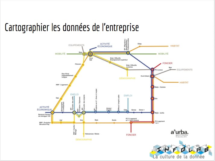 Initier une culture de partage des données nécessite bien souvent dans un premier temps de cartographier les données. De savoir et comprendre lesquelles sont disponibles, qui les collecte, qui les détient, quel est leur cycle de vie, comment s’organisent les sauvegardes, etc. Autant de questions pratiques qui permettent bien souvent d’aider le travail de l’administrateur général des données d’une organisation. L’agence d’urbanisme bordelaise A’urba a ainsi créé une cartographie des différentes données de Bordeaux Métropole qu’ils utilisent sous forme de plan de métro pour dresser une forme d’urbanisme des données dans les systèmes d’information de l’agglomération bordelaise. Ce type de cartographies permet de construire des stratégies adaptées : identifier les producteurs de données, les données les plus importantes ou les plus réutilisées… Cela permet également de souligner combien les données relèvent de plusieurs responsabilités et donc de mieux organiser leur gouvernance et de la pérenniser. On voit naître par exemple des chartes d’usages des données, une documentation qui permet de donner de l’épaisseur aux pratiques des organisations autour des données, d’insister sur la responsabilité et de définir des bonnes pratiques autour de la protection des données personnelles notamment, à destination des clients extérieurs ou comme guide des bonnes pratiques internes à l’entreprise. A l’exemple de la charte data de la Poste.
