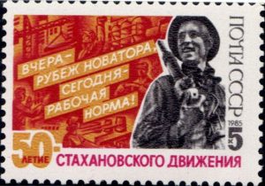Stakhanov, vous connaissez surement ? L’ouvrier soviétique qui en 1932 a extrait 102 tonnes de charbon en 6h, soit quatorze fois plus que le quota demandé à un mineur (qui devait donc en extraire tout de même 7 tonnes en 6h). Aujourd’hui, nous savons qu’Alekseï Stakhanov n’a jamais réussi cet exploit seul, mais le pouvoir soviétique avait besoin d’un héros pour galvaniser le peuple, vanter les capacités de l’homme nouveau, l’homme soviétique, montrer l’adhésion des travailleurs au régime et à la construction du socialisme, mais aussi pour avoir une bonne raison pour augmenter les quotas de production au passage. Ce timbre pour fêter les 50 ans du mouvement stakhanoviste disait ainsi : « Hier c’était la limite d’un innovateur, aujourd’hui c’est une norme de travail ! »
