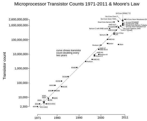 La Singularité technologique est apparue dans les romans de SF du mathématicien et informaticien Vernor Vinge, sans aucune prétention scientifique, avant qu’il ne la théorise dans un essai en 1993. « Nous sommes donc passés de la science-fiction à la science », constate Ganascia. Si Vinge ne fut pas le premier à imaginer l’autonomisation de la technologie, il argumente son extrapolation en se référant à la fameuse loi de Moore, du nom d’un des fondateurs d’Intel, qui constate en 1965, que les capacités de stockage d’information et la vitesse de calcul des processeurs doublent à un rythme exponentiel. Cette loi d’observation, cette « formule empirique », même si elle s’est avérée juste jusqu’à présent, n’assure pourtant aucune validité future. Et les limites atomiques du silicium montrent qu’elle ne devrait pas tarder d’atteindre un mur, ses limites (imminentes, prévues pour 2016 ou 2021… qui annoncent surtout une limite économique plus que technique). Si une autre technologie pourrait prendre le relai, rien n’assure qu’elle suive la même constance. Bref, « l’observation de la loi de Moore sur les cinquante dernières années ne garantit nullement sa validité dans le futur ». Comme il le souligne encore « l’examen rétrospectif des études prospectives montre que le futur obéit rarement aux prévisions. Le progrès est convulsif ! Il n’existe pas de déterminisme technologique. » Mais surtout, souligne Ganascia, il y a un paradoxe logique à la Singularité : comment une rupture technologique pourrait-elle se déduire d’une loi reposant sur la régularité du cours de la technologie ?