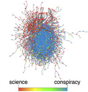 Cette dérégulation introduit un autre biais : l’effet de polarisation. L’effet de polarisation c’est le fait que les individus vont avoir en moyenne un point de vue plus radical que la moyenne de leurs points de vue individuels s’ils n’avaient pas échangé ensemble, comme l’a notamment montré les travaux de Walter Quattrociocchi, qui coordonne le Laboratoire des sciences sociales computationnelles à l’IMT de Lucques, qui montre très bien comment le biais de confirmation et l’effet de polarisation se combinent dans la diffusion de la désinformation (voir également l’article qu’il publiait sur Pour la Science). Gérald Bronner montre l’un des graphiques produits par Walter Quattrociocchi dans une de ses publications étudiant la viralité de la désinformation et le rôle de l’homophilie et de la polarisation.