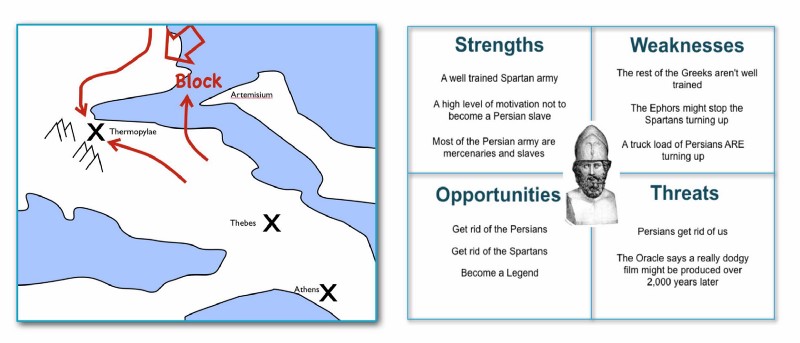 Image : la bataille des Thermopyles version carte et version Swot.