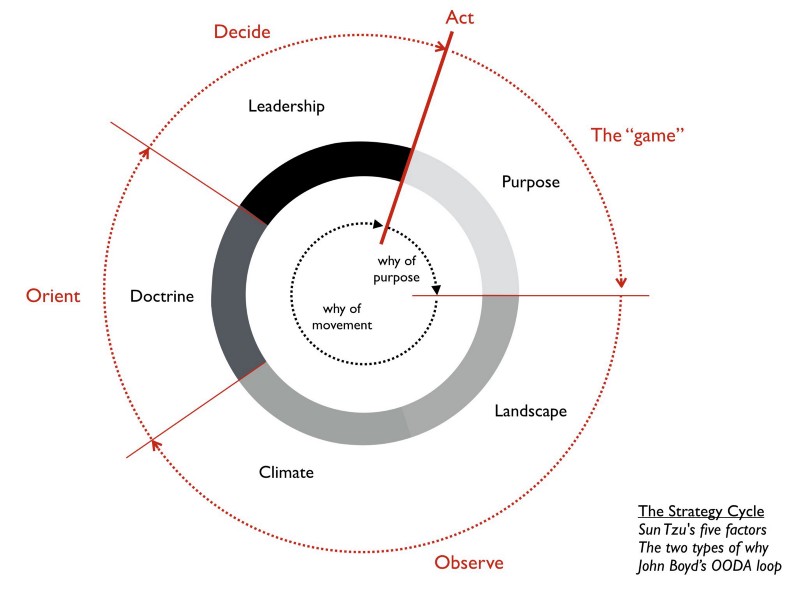 Le pilote de chasse, instructeur et stratège de l’armée américaine, John Boyd, est l’inventeur de la boucle OODA un gimmick pour aider les pilotes à décider reposant sur 4 processus : « observer, s’orienter, décider et agir ». Ces processus montrent que toute stratégie repose d’abord sur la question du pourquoi… « Mais il ne faut pas confondre le pourquoi de l’objectif (devenir le meilleur de son secteur par exemple) et le pourquoi des mouvements. Aux échecs, le pourquoi de l’objectif c’est de gagner. Mais le pourquoi des mouvements c’est savoir quelle pièce bouger à chaque coup. Chez Fotango on voulait être les meilleurs du service photo en ligne. Mais comment y parvenir ? Quels mouvements devions-nous faire pour cela ? »