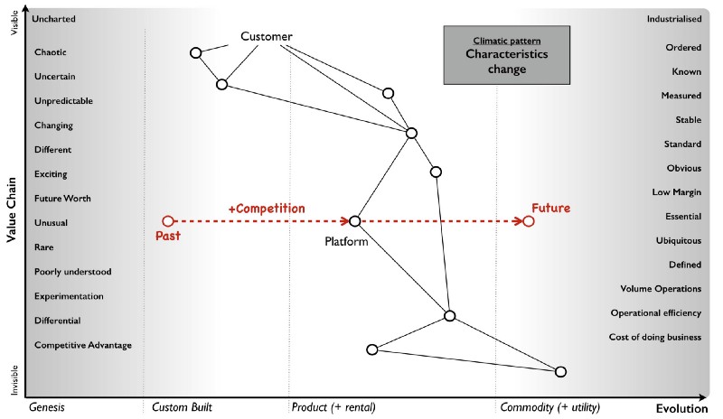 Image : une des cartes produites par Simon Wardley qui montre une chaine de valeur avec différents éléments à des stades d’évolution différents…