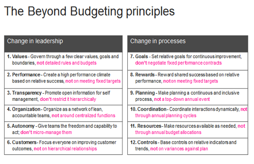 Image : le détail des 12 principes pour dépasser le budget et leurs implications sur le leadership et les processus, via Bjarte Bogsnes.