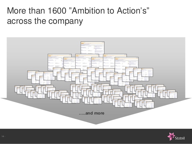 Image : les fiches actions imbriquées de Statoil tirées d’une présentation de Bjarte Bogsnes.