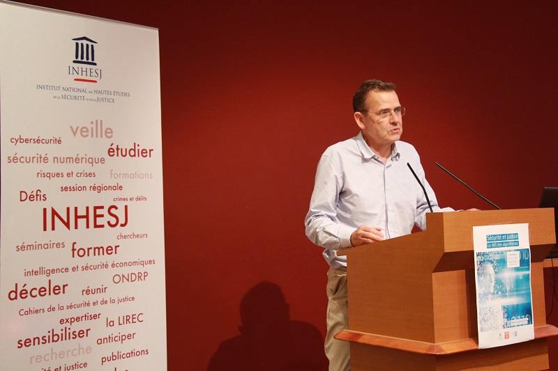 Image : Antoine Garapon sur la scène du colloque AlgoEthique, Inhesj.