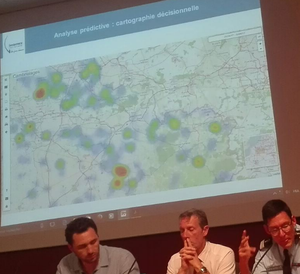 Il montre d’autres cartes provenant d’un autre outil qui sont des cartes de chaleur indiquant les cambriolages pour la semaine à venir. Un système prédictif basé sur les enregistrements des cambriolages sur les 5 dernières années. « C’est encore un travail de R&D. On va les utiliser à partir de septembre pour voir si ça peut permettre de prévoir les tournées des patrouilles sur le terrain. » En Aquitaine, ils utilisent déjà un système similaire et prennent en compte les recommandations du logiciel pour réaliser les patrouilles. Les premiers retours sont que ces outils finalement n’annulent pas la délinquance, mais la repoussent. Un constat qui rappelle celui qu’on adresse à la vidéosurveillance. Reste que pour l’instant, le système fait apparaître des zones à risque qui semblent recouper les observations de terrain.