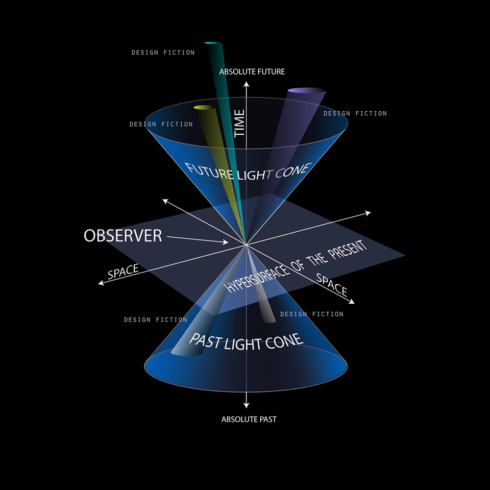 Les deux cônes inversés taillent le présent en diamant, le futur et le passé pesant de tout leur poids sur le présent, le comprimant jusqu’à ce qu’il ne soit plus qu’un infime instant, à peine perçu, comme ces roches dont on veut mesurer la dureté. Car le diamant est utilisé dans les cellules à enclume de diamant pour connaître la composition des roches du noyau terrestre, tout comme le passé et le futur permettent de sonder notre présent pour en révéler non pas des compositions physicochimiques mais des dispositions automatiques, des comportements normatifs ainsi que des croyances (tous impulsés par le faisceau incident, représenté ci-dessous). Et c’est dans le présent qu’opère le design fiction, par la création d’un récit sur le futur ou le passé qui déstabilise notre présent et nous incite à développer d’autres horizons en passant par le débat et le raisonnement critique (faisceau diffracté, représenté ci-dessous)