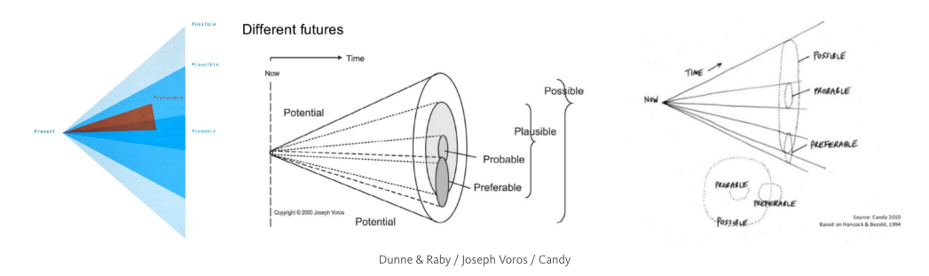 Comment s’y prendre pour opérer ces déviations ? Le design fiction donne à y penser en décochant ses flèches sur la cible des possibles, et marque des points selon qu’il vise les plausibles, les probables ou les préférables. Comme on coupe les cheveux en quatre, Norman Henchey propose de découper le futur en 4 : possible, plausible, probable, préférable, spectre maintes fois illustré par les pratiquants du design fiction :