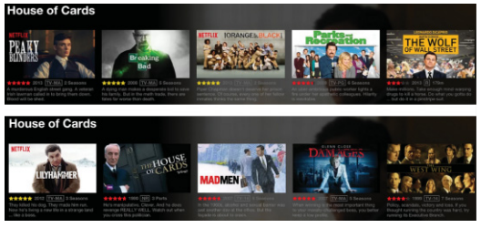 Image : exemple de recommandation liée à House of Cards. La recommandation de la ligne inférieure est plus pertinente, mais elle produit moins de résultats effectifs, c’est-à-dire de visionnages, que de montrer des vidéos qui ont une popularité plus forte, comme c’est le cas de la ligne de recommandation supérieure.