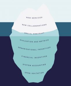 La startupisation ne regarde l’innovation que sous l’angle du développement de nouveaux services. Or, pour créer du changement, les nouveaux services ne sont que le haut de l’iceberg, résume l’entrepreneur Indy Johar de la Young Foundation dans un intéressant graphique (qu’évoquait longuement le blog de la 27e Région). Produire des changements plus durables nécessite de dépasser la seule innovation servicielle et courtermiste que proposent les startups, pour privilégier d’autres formes d’innovation. En regardant les problèmes que sous l’angle de leurs solutions, l’acteur public se contraint à être confronté à toujours plus de solutions servicielles, sans prioriser entre elles ou sans se doter pour autant d’objectifs ou de stratégies. Sans feuille de route, quels services favoriser ? Quelles orientations prendre ? Face à une innovation devenue foisonnante, bien qu’homogène, comment piloter l’innovation ? Comment soutenir les startups ? Sur quels critères ?… Les nouveaux services ne sont pas toujours raccords avec la stratégie quand elle existe. Comme pour mieux contraindre l’innovation foisonnante, les stratégies réussies ont tendance à devenir plus radicales à l’image de la politique zéro déchet de San Fransisco ou zéro carbone de Copenhague. Sur l’iceberg de l’innovation, on ne célèbre que les nouveaux services, sans regarder ce qui est abandonné sous la ligne de flottaison : la stratégie, la cohérence, l’objectif économique, politique et social.