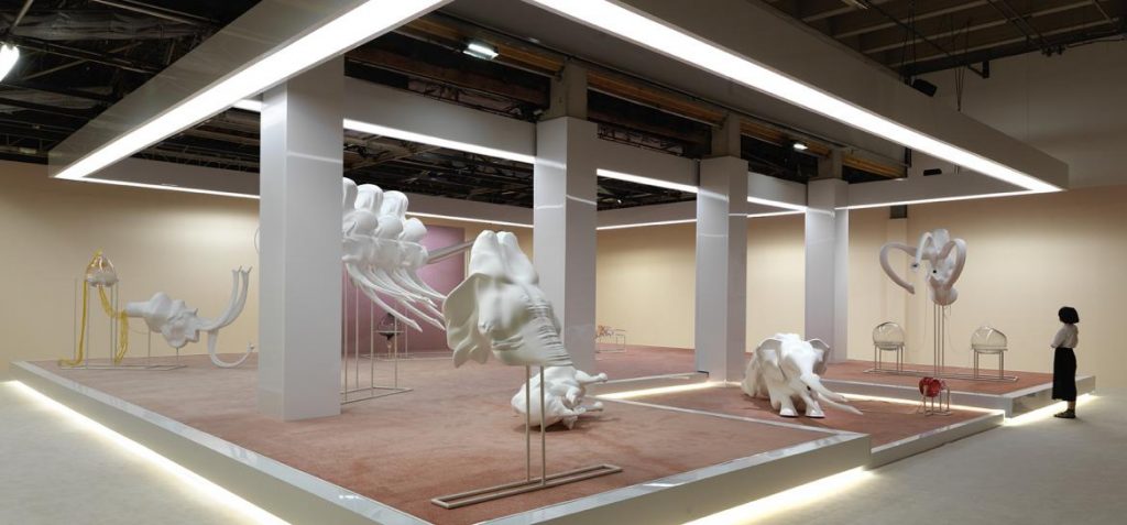 C’est une scène de ce type que Marguerite Humeau a reconstruit d’une manière monumentale au Palais de Tokyo (vidéo), comme un opéra de créatures préhistoriques, faisant entendre un monde où les éléphants auraient été plus humains qu’ils ne le sont, où leurs voix auraient porté un sens.