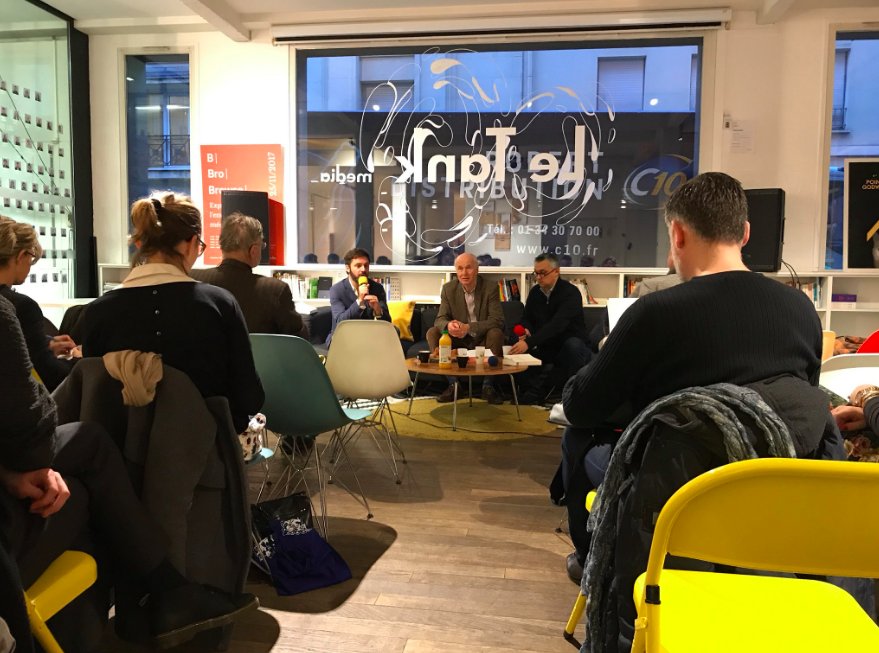 Image : Nicolas Vanbremeersch, Patrice Flichy et Henri Isaac au Tank, photographiés par Renaissance Numérique.