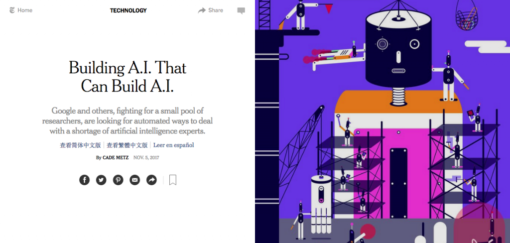 Comme le soulignait une grande enquête du New York Times signée Cade Metz en novembre dernier, la recherche sur des systèmes d’intelligence artificielle capable de construire des machines intelligentes est en plein boom. AutoML, cette « machine algorithmique capable de construire des machines algorithmiques », est un outil qui vise à pallier le déficit de compétences en matière d’IA, afin de générer des outils d’IA simples d’utilisation. Amazon et son MXNet, Microsoft et son CNTK sont aussi de la partie. Et d’autres que les Américains ne sont pas en reste, à l’image du chinois Malong Technologies… Comme le souligne le New York Times, construire des solutions de Machine learning n’est pas encore aussi simple que de construire un site web : passer de l’entraînement des données qui peut être assez simple effectivement, à leur intégration dans un service, nécessite malgré tout encore beaucoup de compétences. Mais cette tendance appelée « meta-apprentissage » (meta-learning ou learning to learn) est visiblement en plein développement.