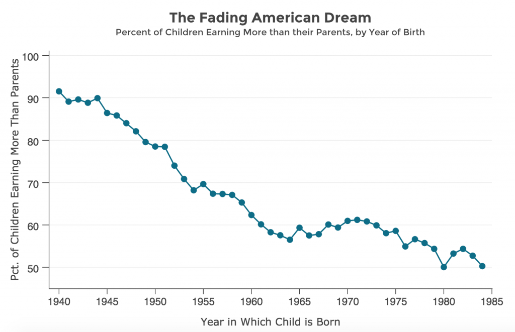 Image : La disparition du rêve américain. Un graphique issu d’une étude du Centre de Stanford sur la pauvreté et l’inégalité où travaille Ray Chetty qui montre l’évolution du pourcentage des enfants américains qui gagnent plus que leurs parents.