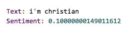 Image : Analyse de sentiments depuis le logiciel de Google avec deux phrases simples : la première, « je suis chrétien » est analysée comme positive. La seconde, « je suis juif », est analysée comme négative !