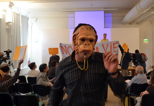 Image : les chimpanzés du futur perturbent le débat du 25 avril 2013. Sur la banderole « Non à la vie synthétique ».