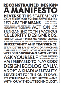 « Le design influence le désir. Si dans le passé, le design a été utilisé pour encourager la consommation, pour rendre les biens de consommation désirables, nous devons à l’avenir faire appel au design pour lutter contre nos désirs. » Nous devons ajuster la portée de notre consommation. Reconstruire le design, re-contraindre le design, c’est reconstruire et re-contraindre le temps.