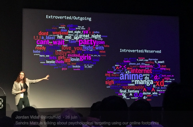 Ces traces disent beaucoup des habitudes et des préférences des gens tant et si bien qu’il est inutile de savoir s’ils sont extravertis ou pas, il suffit de regarder leurs activités sur les réseaux sociaux et traduire ces données via des algorithmes en données et profils psychologiques significatifs, explique Sandra Matz. Sur la scène d’USI, elle montre des nuages de mots corrélés à quelques-uns des 5 grands types de profil. Ces nuages ne montrent pas tant des fréquences d’utilisation de mots clefs, que l’usage de certains mots a plus tendance à vous classer dans une catégorie qu’une autre. Ainsi les extravertis ont tendance à parler de soirée, d’impatience… de ce qu’ils font avec les autres, alors que les introvertis par exemple parlent plutôt de manga et d’ordinateurs… de choses qu’ils font par eux-mêmes. Pour Sandra Matz, cela ne se base nécessairement pas sur des algorithmes compliqués que sur une classification et un comptage de mots, explique-t-elle en continuant de montrer des nuages de mots selon de grands types de profil, qui donnent l’impression d’avoir à faire à des gens très différents les uns des autres par les mots mêmes qu’ils emploient. De même, on peut appliquer ces classements aux likes que les gens déposent sur les contenus… Ainsi, les gens qui ont tendance à être névrosés ont tendance par exemple à mettre des likes sur des expressions comme « Parfois, je me déteste » ou « je suis tellement content » ou à apprécier Kurt Cobain, alors que les personnes stables vont apprécier des contenus relatifs à l’administration des affaires, au Parkour, à comment gagner de l’argent… Le profilage psychologique permet ainsi de relier des contenus et leur vocabulaire à des types de profils.