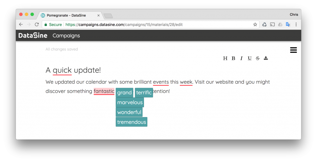 Image : l’interface de rédaction de DataSine qui propose des suggestions de termes pour adapter les messages en fonction du profil psychologique ciblé.