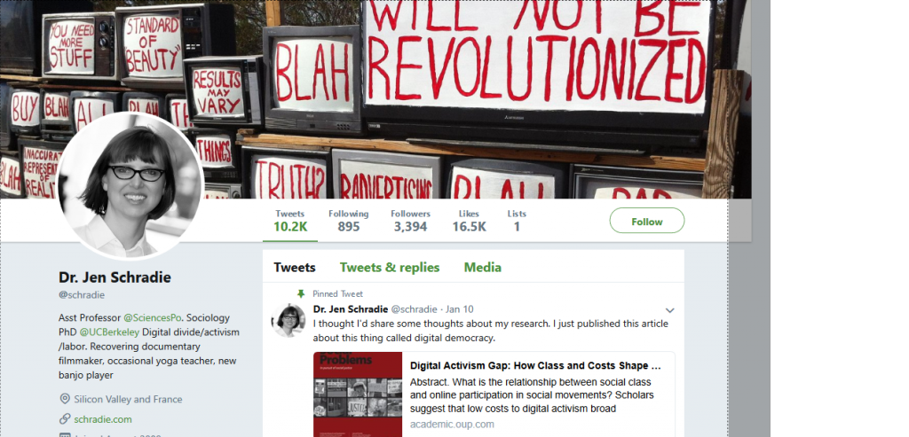 Jen Schradie (@schradie) est sociologue, professeur à l’Observatoire sociologique du changement de Sciences Po. Elle a travaillé aux États-Unis sur les inégalités numériques et étudie la façon dont les inégalités sociales se prolongent en ligne. Ses recherches montrent les limites du discours utopique sur les vertus démocratiques d’Internet et rappellent que le monde en ligne ne représente pas la totalité du monde social. Elle publiera en mai The revolution that wasn’t : How Digital Activism Favors Conservatives (La révolution qui ne l’était pas : comment l’activisme numérique favorise les conservateurs, Harvard University Press).