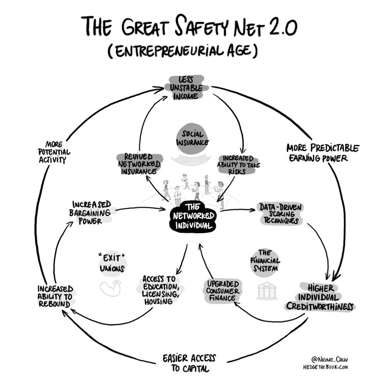 L’éditorialiste et essayiste Nicolas Colin (@nicolas_colin), cofondateur du fonds d’investissement The Family, co-auteur du rapport Colin & Collin sur la fiscalité de l’économie numérique en 2013, de L’âge de la multitude en 2012 et auteur d’un nouvel essai Hedge – a Greater Safety Net for the Entrepreneurial Âge, fait le même constat, mais dans un prisme plus étasuno-centré : « La crise de la classe moyenne occidentale est longue dans son processus. Il y a eu la mondialisation, puis la financiarisation et tout s’est encore accéléré avec la technologie. Les Âges Sombres de la financiarisation ont conduit à transférer davantage de risques sur les individus, à démanteler efficacement le Grand Filet de Sécurité 1.0 et à imposer un fardeau excessif au système financier. Maintenant que nous passons à un nouveau paradigme techno-économique, il est temps d’imaginer de nouvelles institutions pour la prospérité et la sécurité économiques. La question est de savoir qui va relever ce défi ».