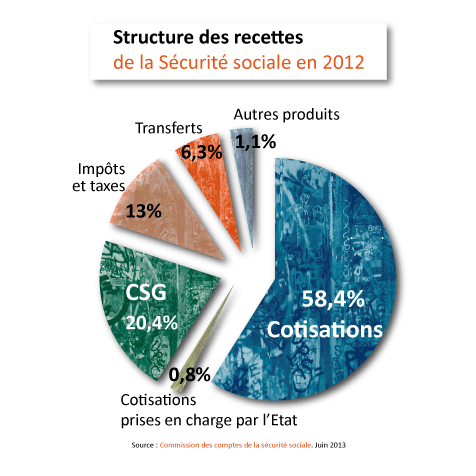 Si au début des années 90, les cotisations sociales calculées sur les revenus du travail représentaient 87 % des recettes de la Sécu, l’assiette de son financement s’est peu à peu élargie à l’ensemble des revenus du ménage : aux produits de placement, revenus de remplacement (chômage, retraite, etc.), revenus du patrimoine… En 2012, les cotisations sociales ne représentent plus que 58,4 % des recettes du régime général de la Sécu.