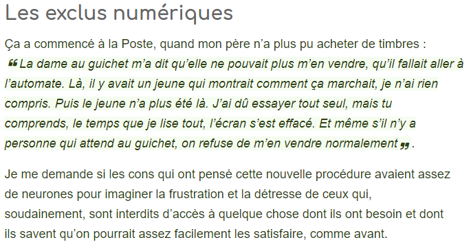Le développement des services en ligne, effectivement, renforce les inégalités, au détriment des plus démunis, de ceux qui rencontrent des difficultés dans les interfaces qui leur sont proposées, surtout quand cette dématérialisation, cette modernisation, se fait en éliminant toute alternative autre que numérique. Il existe réellement des exclus du numérique, des gens irréconciliables ou réfractaires, voire interdits d’accès par la complexité cognitive des outils mis en place, et ce d’autant plus qu’ils sont souvent sans alternatives. Et il est probable que peu d’actions puissent les conduire à changer d’avis… ou de comportement. Car ce que le numérique transforme justement, c’est la forme même de la relation. En remplaçant un contact humain par une interface à manipuler, on exige de s’adapter à une modalité que nous n’avons pas tous envie d’adopter, ou pas tous les capacités de comprendre. Et ce d’autant plus que ces interfaces sont rarement modulaires : elles s’adaptent rarement à vos actions, à votre compréhension, à vos compétences ou à vos handicaps. L’inscription à Pôle emploi ou à Parcoursup (et la conception de ce service est certainement l’un des pires exemples, en terme de conception, qu’on puisse pointer par rapport au nombre de personnes qu’il affecte), la déclaration de revenus en ligne ou les déclarations d’Urssaf, la borne pour prendre des billets de trains ou de timbres… sont bien souvent conçues pour un utilisateur unique (masculin, conscient, blanc, valide, aisé, sans handicap, avec un bon niveau culturel…), mais qui n’existe pas comme le pointait le designer Anthony Masure. Alors qu’on exige des établissements recevant du public, physiquement, qu’ils permettent l’accès aux publics dans leur plus grande diversité (de handicap, de langue, de niveau culturel ou économique), où sont les interfaces de ces services qui s’adressent aux publics en difficulté, qui répondent à leurs difficultés au moment où ils les éprouvent ?