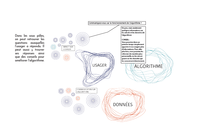 C’est là quelques-uns des enjeux que pose le groupe de travail Nos Systèmes de la Fing, dans sa deuxième année de travail. Dans le cadre de plusieurs jours d’ateliers avec les étudiants en design de l’ENS Cachan et de l’école Boulle, nous nous sommes intéressés à cette question de l’impact social des algorithmes publics, en invitant des projets portés et soutenus par Etalab, à questionner avec nous ces enjeux, en partant de la grille d’analyse que nous avions construite, qui souligne que la responsabilité sociale des systèmes nécessite de la médiation, de l’explication, de la jouabilité, de la symétrie et de l’ouverture.