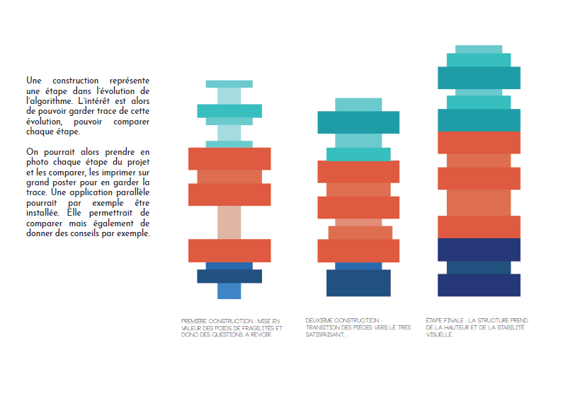 Le dernier projet sur lequel ont travaillé les étudiants de Boule et de l’ENS Cachan consistait à réfléchir à un outil d’auto-évaluation du risque algorithmique, inspiré de ceux existants. C’est l’une des promesses sur laquelle nous travaillons dans le cadre du programme NosSystèmes de la Fing : offrir un outil d’auto-évaluation de projets pour améliorer leur responsabilité. Les étudiants ont réfléchi à comment simplifier le questionnaire d’EthicsToolkit.ai, selon 3 pôles : les algorithmes, les données et les usagers (ou les impacts de leurs usages), afin de donner corps à la grille que nous avons établie. Leur proposition se décompose sous deux formes : une interface numérique qui évolue au gré des réponses pour montrer visuellement les faiblesses des projets et faire des recommandations adaptées. Et une interface physique, qui dessine, selon les réponses aux questions la silhouette d’un algorithme, rendant concret son équilibre, sa stabilité… à la manière d’un jeu de construction. L’objet permet de rendre concret l’analyse d’impact algorithmique en en faisant un outil de négociation et de débat pour les équipes qui envisagent le développement d’outils algorithmiques.