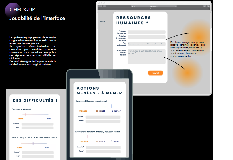 Images : Le simulateur Signaux Faibles propose d’abord un outil pour réaliser son bilan. Il permet ensuite à l’entrepreneur de jouer des critères d’auto-évaluation. Et enfin propose un bilan qui montre les points de forces et de faiblesses. Voir la présentation réalisée par les étudiants ainsi que l’outil de simulation factice mis en place.