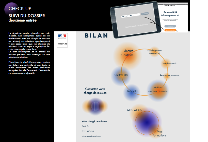 On comprend vite ici que l’enjeu n’est pas tant d’inspecter le calcul ou de le rendre transparent, qu’il n’est pas d’interroger la qualité du calcul, mais de regarder son impact et la relation qu’il instaure. Les étudiants se sont donc attachés à réinventer cette relation, notamment dans la perspective d’un déploiement national de Signaux faibles, en imaginant un dossier pédagogique pour les chargés de mission, en insistant sur l’aide qu’ils peuvent apporter plus que sur le problème à traiter. L’autre idée qu’ils ont exploré consiste à transformer le service d’alerte en un service d’auto-évaluation. Alors que les grandes entreprises disposent d’outils de monitoring et de prédiction, ce n’est effectivement pas le cas de nombres de PME ou d’ETI. Un simulateur pourrait permettre aux entrepreneurs de faire régulièrement le check-up de leur entreprise (avec des données plus à jour que celles dont dispose actuellement Signaux faibles, permettant donc aussi d’améliorer le système). L’outil permettrait aux petites et moyennes entreprises d’avoir accès à un outil de monitoring, de mieux comprendre leur situation, d’accéder à des alertes et remèdes possibles. Un simulateur permettrait également d’intégrer des modalités de prédiction permettant au chef d’entreprise de mieux cerner les conséquences de ses options selon différents curseurs à sa disposition, afin qu’il puisse jouer de la prédiction réalisée et mieux la comprendre. La proposition des étudiants visait à créer une relation plus optimiste, en mettant l’accent sur les points positifs et pas seulement négatifs, pour imaginer une relation plus fluide, moins frontale. Chaque entreprise une fois qu’elle a fait son check-up peut ensuite accéder aux aides et actions possibles et être mise en relation, si elle le souhaite, avec des chargés de mission pour obtenir un accompagnement adapté. Dans leur proposition, les étudiants ont joué de l’asymétrie actuelle de Signaux faibles pour la renverser et redynamiser la relation entre services publics et entreprises, en imaginant une transformation radicale du service dans la perspective de sa généralisation. La proposition apporte une perspective plus large au projet, sous la forme d’un tableau de bord qui s’adresse à toutes les entreprises et pas seulement à celles en difficultés. En améliorant la symétrie et la pédagogie, elle rend le dispositif moins anxiogène aux entreprises comme aux acteurs publics.