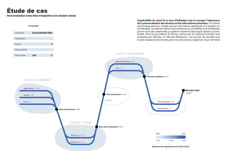 L’un des premiers sujets qui leur étaient proposés consistait à travailler sur la Taxe d’habitation. Comment la rendre plus compréhensible, à la fois pour qu’elle puisse mieux répondre aux nouvelles obligations légales qui s’appliquent et au fait que les citoyens peuvent désormais demander une explication sur le calcul qui est produit ? La taxe d’habitation repose sur un calcul compliqué qui n’a pas été révisé depuis longtemps et qui dépend des déclarations initiales du propriétaire. Comment améliorer l’explication et la compréhension du calcul que la feuille d’imposition propose ? Les étudiants ont passé beaucoup de temps à entrer dans le calcul, à tenter de le comprendre. Quelle explication, quelle pédagogie mettre en oeuvre pour faire comprendre ce qui est calculé ? Les étudiants étaient confrontés à des questions de design, visant à contextualiser les informations, pour offrir au public des moyens de comparaison par exemple. Pourrait-on proposer une nouvelle feuille d’imposition en redonnant aux citoyens un peu plus d’information que l’administration fiscale a sur eux ?